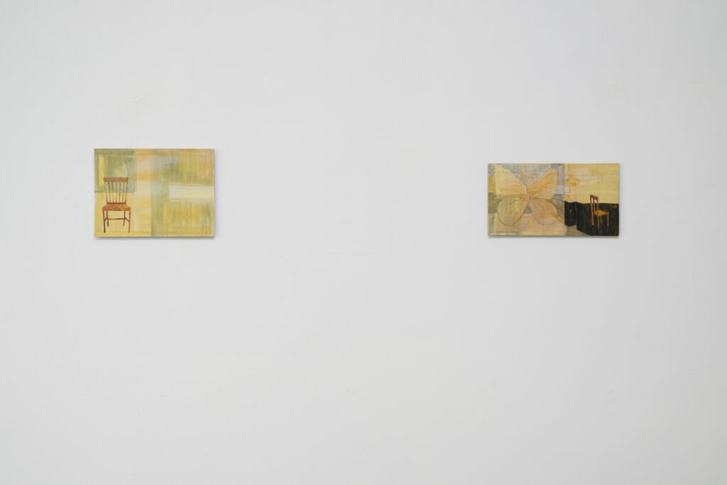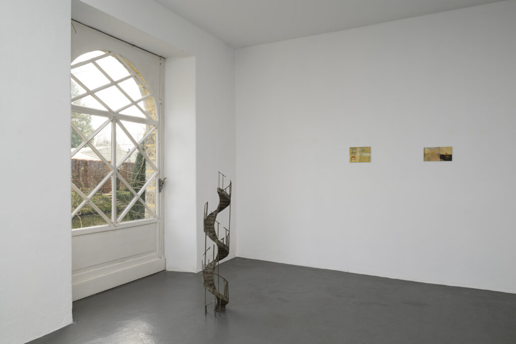 Op de benedenverdieping stap je meteen Kerstens dromerige wereld binnen. Tegen witte wanden hangt een tiental kleine schilderijen, uitgevoerd in zachte blauw- en geelpasteltinten en opgebouwd uit meerdere transparante lagen. Door hun bescheiden formaat word je gedwongen dichtbij te komen. Eén van de schilderijen laat me niet los: een landschap met twee nachtvlinders. Ze lijken te rusten op wat eikeltjes zouden kunnen zijn. Of misschien zijn het hun eigen cocons, van waaruit ze zojuist zijn ontpopt. Dat beeld van de cocon als omhulsel maakt de nachtvlinders tot symbolen van metamorfose: waar het ene eindigt, dient het andere zich al aan. Dat idee van transformatie keert ook terug in de sculpturen van wenteltrappen die overal in de tentoonstelling opduiken. Als vormen van overgang verbeelden zij een tussenruimte, een plek tussen beneden en boven, tussen het verleden, het nu en de toekomst.